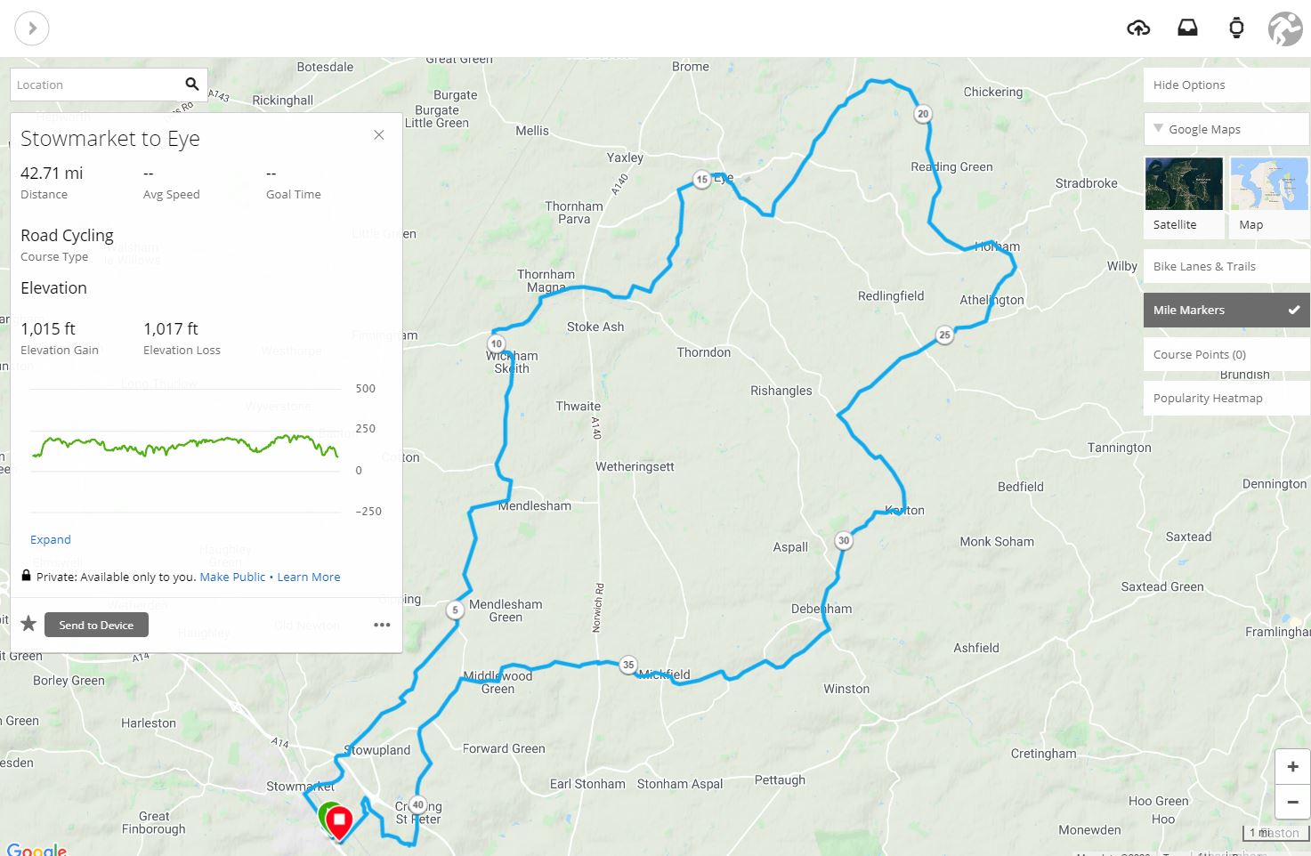 Hilary not cycling so the four of us set off through Combs then along a lovely undulating road with almost no traffic. Stopped at Kersey to admire the cygnets and met a walking couple who suggested we get refreshments at Kersey Mill. Good stopping place for future rides. On to Lavenham, coincidentally arriving as Hilary was walking out of the car park. Lunch in the Cock Horse Inn, finding some shade outside. Temperature well into the 30s so hot when we'd stopped biking. Cut the return route short from the map below, going through Brettenham and Little Finborough. Stopped for an ice cream in Combs, Tony's request.